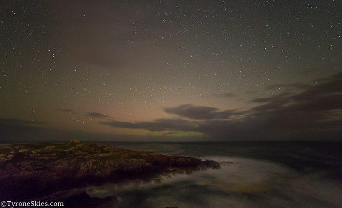 We were aware of a small chance of aurora activity on the night and sure enough i caught this green glow on the horizon with subtle red colour above. What was also noticable on the night was the green airglow in the sky, probably the brightest ive ever seen. You can see it above and to the left of the aurora.
